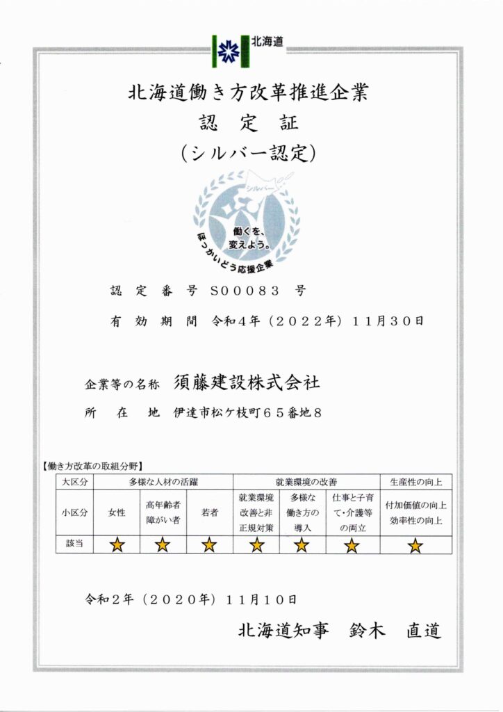 この度、当社は北海道の取り組みである「北海道働き方改革推進企業認定制度」のシルバー認定を受けました!