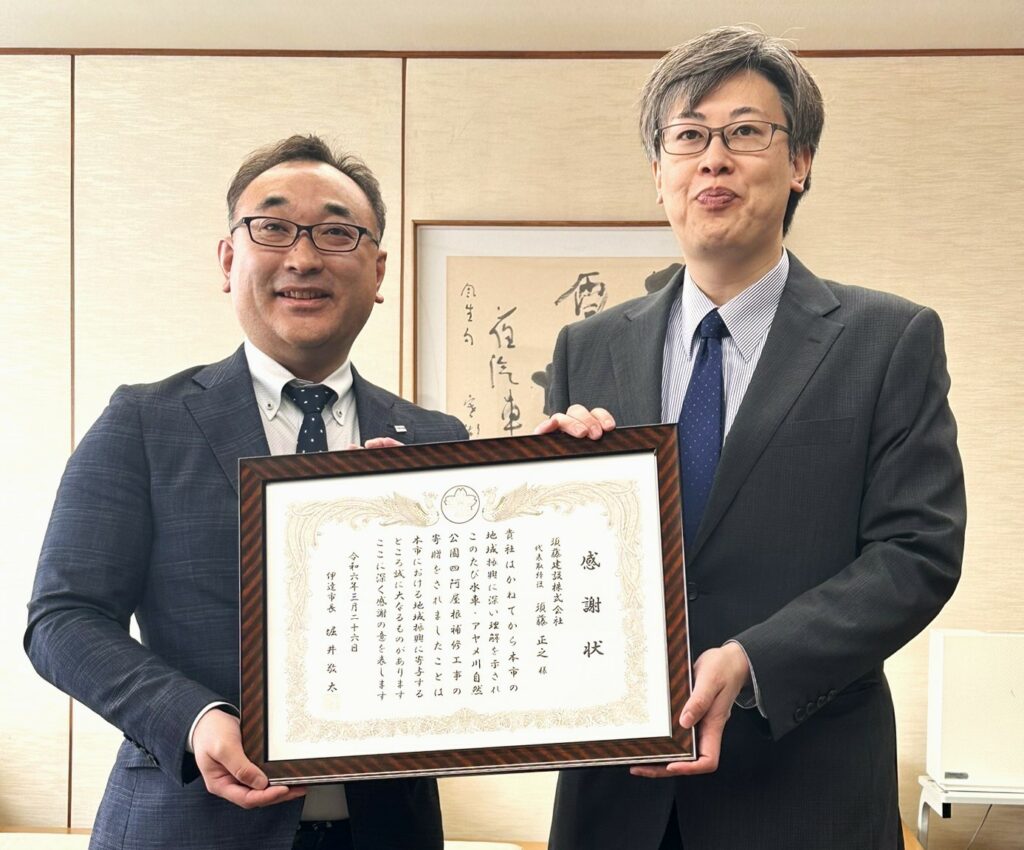 社会貢献事業として今年1月に行った「水車・アヤメ川自然公園の東屋の屋根補修」に対して、3月26日に伊達市から感謝状をいただきました。