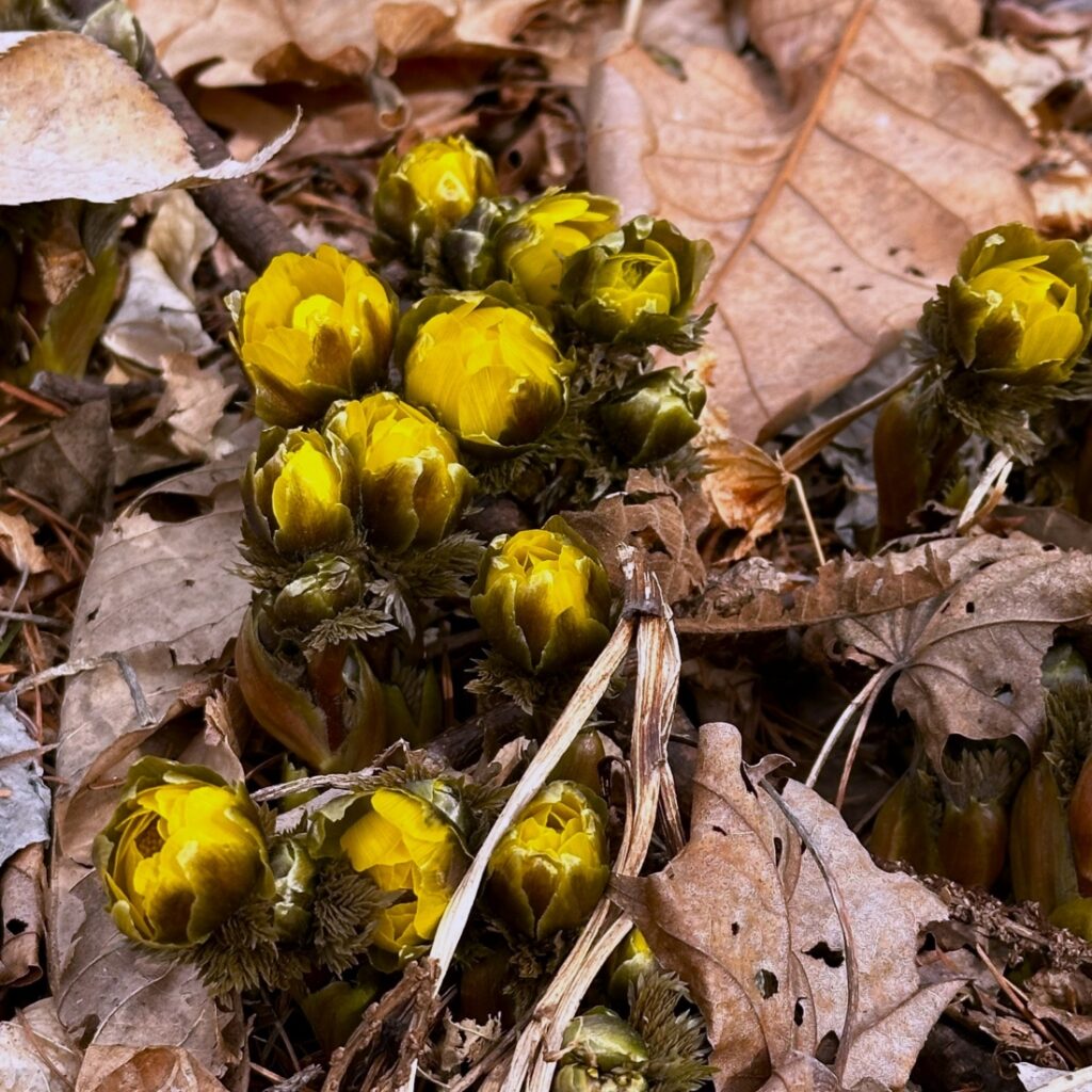 春の東屋の周りを見るとフクジュソウの黄色いつぼみが顔を出しています。