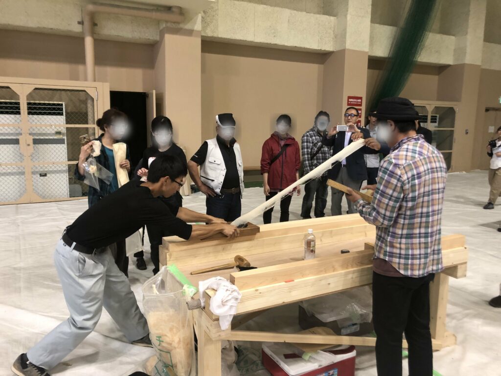 削ろう会とは、カンナでいかに薄く木を削るかを競うイベントで、大工や大工を目指す高校生・専門学生が数ミクロンの世界を競い合い、楽しみながら市民の皆さんと大工職人たちが交流する場です。