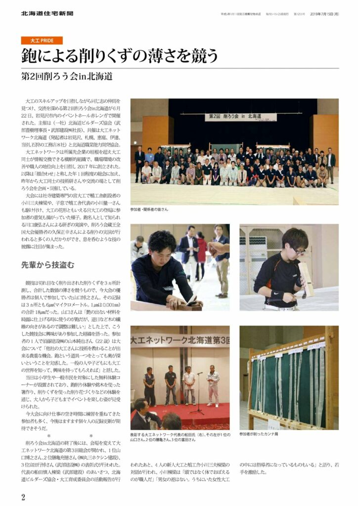 本大会は、大工ネットワーク北海道と北海道ビルターズ協会が主催し、削ろう会の本部から小川棟梁を含め、4名の名人も参加いただき技を見せて貰いました。