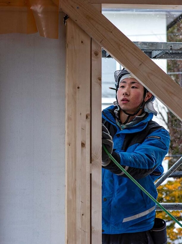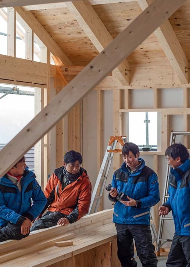 大工部門の主な仕事は、一般木造建築を中心にした住宅関連の大工仕事です。伝統的な技術だけではなく「新木造住宅技術研究協議会」や「北の木の家」、「北海道ビルダーズ協会」、「JBN・全国工務店協会」などの活動に参加し、新しい工法や考え方を取り入れて、地域材や無垢材の特色を活用した注文住宅を一棟一棟、丁寧かつ、センスよく手づくりする職人の集団です。