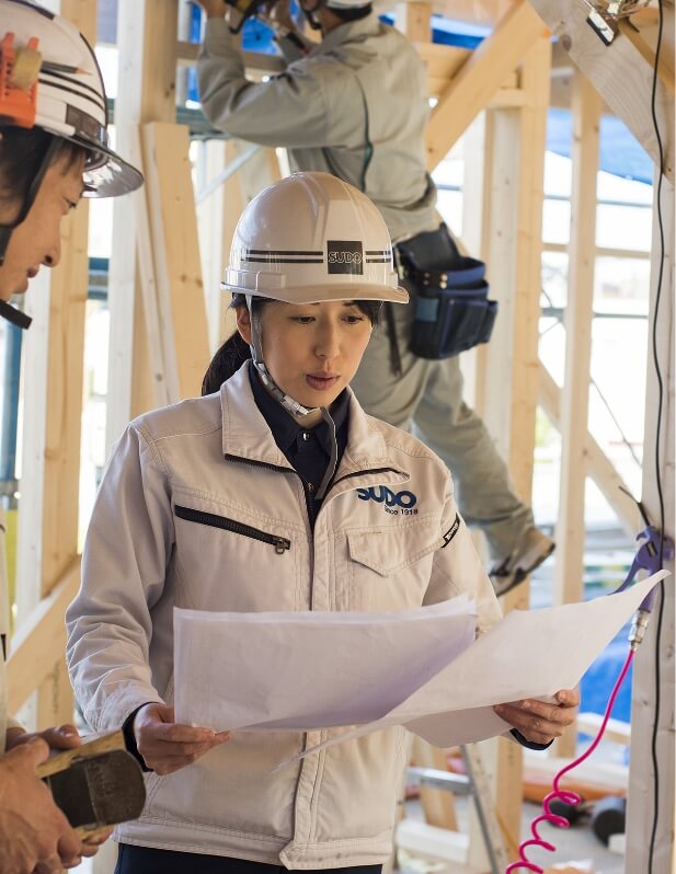 設計業務では、お客様についてさまざまな角度からヒアリングを行い、自由な発想で一人一人に合わせたプランを提案します。施工管理業務では、工事の工程管理や予算管理、現場の安全管理や建築物の品質管理を担います。SUDOホームには、営業専門職はありません。お客様との対話から設計、施工管理まで、さまざまな役割をトータルに経験することで、住宅建築全般を広く深く理解していくことができます。家づくりを通してお客様の理想を叶え、より豊かで楽しい暮らしの実現をサポートするやりがいのある仕事です。