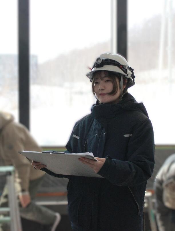 ニセコ支店で建築部門の施工管理をしています。施工管理は平面の設計図を現場の状況を確認しながらきちんと建物に起こしていく仕事です。設計図は意外に間違っていることもあるし、現場の状況と違うこともあるんです。だから私たちが現場で考えないといけないことがたくさんあります。